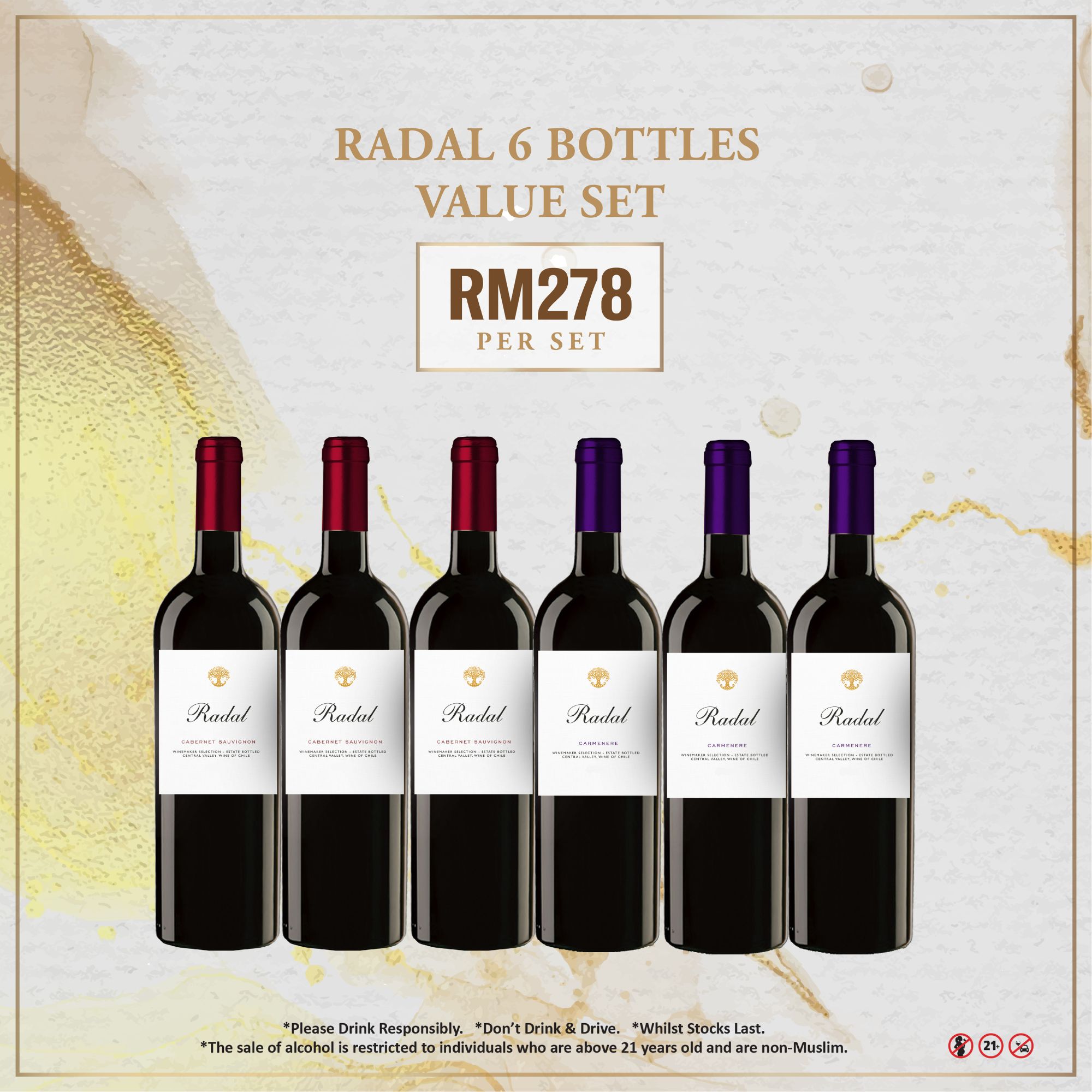 | Variant | Cabernet Sauvignon x 6, Carmenere x 6, 3 Cab Sau + 3 Carmenere |